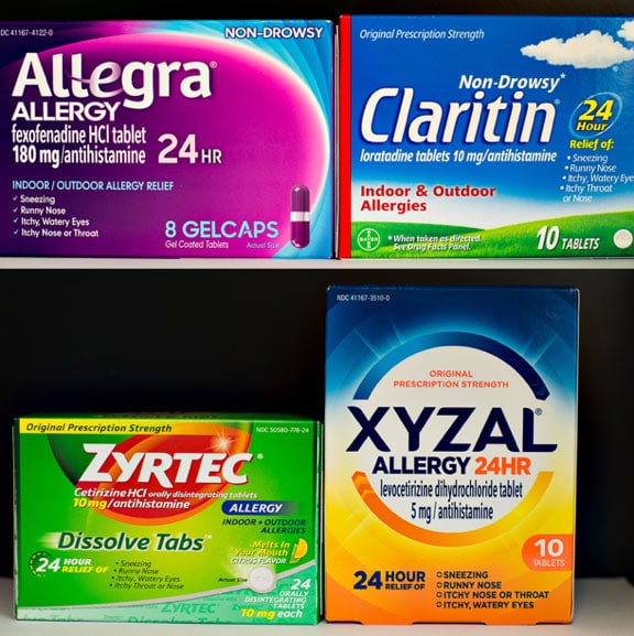 Oral antihistamines: Zyrtec ® (cetirizine), Allegra ® (fexofenadine), Claritin ® (loratidine), Zyxal ® (levocetirizine). (fig 3) Personally, we use and recommend the generic equivalent for each of these… almost all grocery stores, pharmacies and ‘big box stores’ will carry these generic equivalents. (There are a number of other antihistamine products… however, most of them will make you sleepy and tired. )