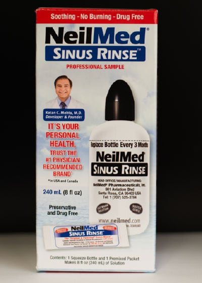 Saline rinses… either a Neti Pot or Neil Med Sinus Rinse ® kit (fig 1). We usually recommend twice per day rinses… especially before using the nasal steroid sprays. Saline rinses alone will provide significant relief.